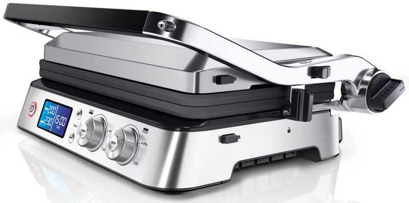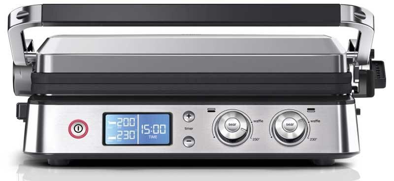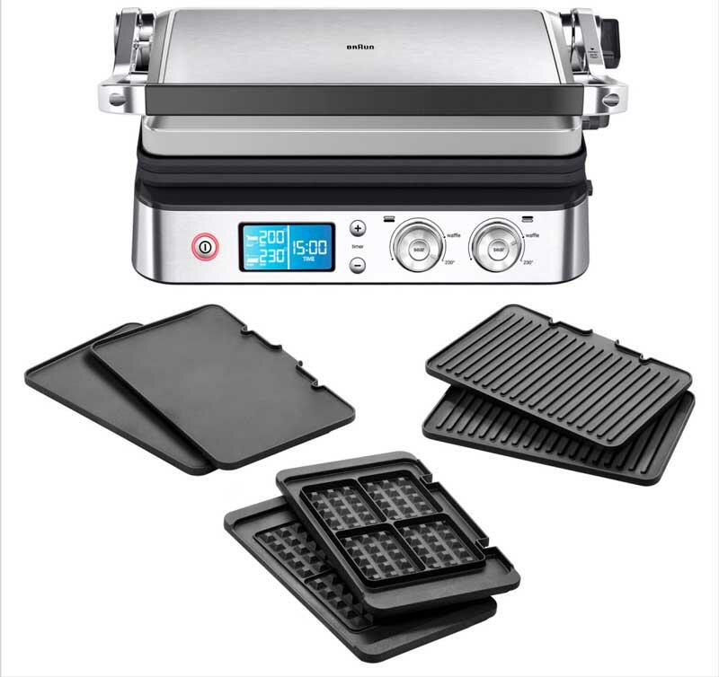 Электрогриль Braun CG9047 позволяет приготовить любые продукты: стейки, колбаски, гамбургеры, овощи или рыбу. Использование прибора простое и понятное: вся необходимая информация указана на дисплее. Эта модель работает в трех режимах: контактный гриль (с закрытой крышкой), открытая жаровня (крышка откинута) и «гриль-печь» (верхняя панель приподнята над нижней). Температура нагрева задается в диапазоне от 60 до 230 градусов отдельно для каждой поверхности при помощи поворотных регуляторов.
