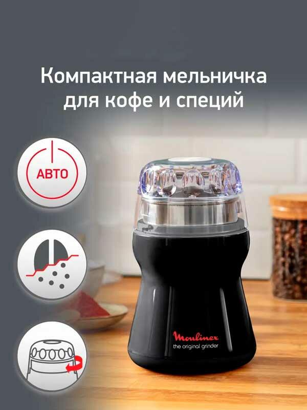 Компактная мини-мельничка от Moulinex проста в использовании благодаря ножу и емкости из нержавеющей стали и прозрачной крышке для удобства регулирования. Измельчитель идеально подходит как для приготовления свежемолотого кофе, так и для создания различных смесей из специй.