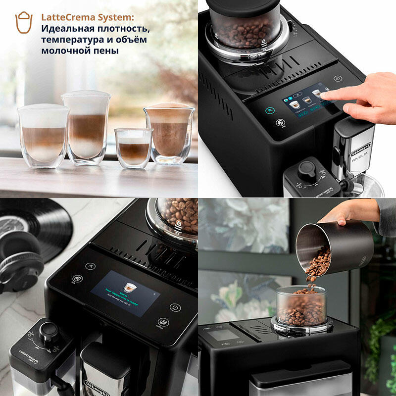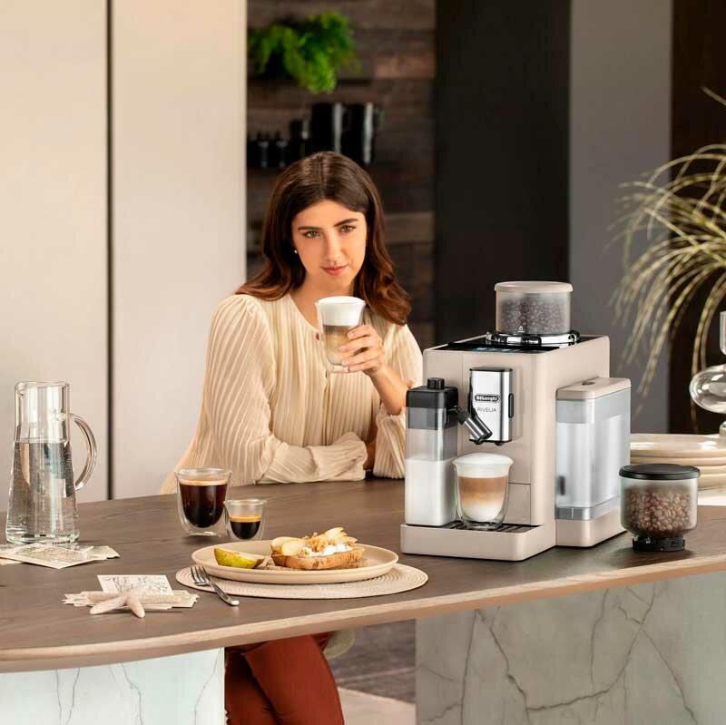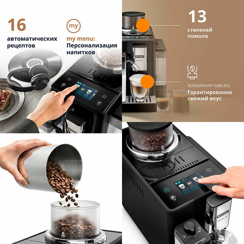 Погрузитесь в фантастический мир кофе с помощью Rivelia. Откройте для себя бесконечное разнообразие сортов кофейных зерен благодаря уникальной системе Bean Switch. Наслаждайтесь захватывающими впечатлениями на ярком 3,5-дюймовом сенсорном цветном дисплее с разнообразной анимацией и предустановленными программами приготовления кофе, которые можно настроить под ваши предпочтения. Добавьте ваши молочные напитки пышную и насыщенную пену с помощью технологии LatteCrema Hot, доступной в этой компактной кофемашине, которая также выделяется своим стильным дизайном. Кофемашина De'Longhi Rivelia предлагает различные преимущества и функции, которые позволят вам наслаждаться кофе максимально комфортно и без усилий. Система переключения зерен позволяет вам легко переключаться между различными сортами кофе и исследовать их вкусовые особенности. Технология Bean Adapt автоматически адаптирует уровень помола, дозу кофе и температуру заваривания в соответствии с выбранными вами зернами, чтобы каждая чашка кофе получилась идеальной. Автоматическая система LatteCrema Hot обеспечивает приготовление пышной и насыщенной молочной пены, идеально подходящей для вашего любимого молочного кофе. Интуитивно понятный цветной дисплей с диагональю 3,5 дюйма обеспечивает удобное управление всеми функциями кофемашины. Вы можете выбрать из 16 различных напитков всего лишь одним касанием. С Rivelia от De'Longhi вы сможете наслаждаться лучшим кофе, настроенным под ваш вкус и требования, в любое время дня. Кроме того, стильный и компактный дизайн с закругленными углами и черным оттенком оникса делает эту кофемашину прекрасным дополнением любой кухни или офисного помещения.
