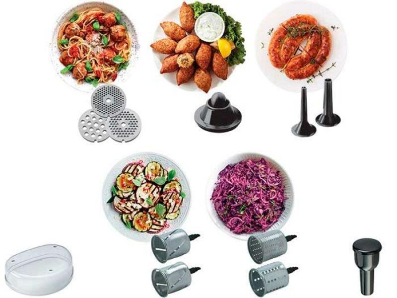 В комплекте поставляются металлические диски с диаметром отверстий 3/4,5/8 мм, терка, овощерезка, шинковка и специальная насадка, используемая для готовки домашних колбасок и кеббе. Модель оснащена специальным отсеком для хранения насадок, что экономит пространство на кухонном столе.