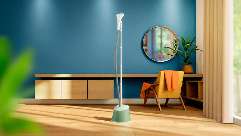 Благодаря компактному дизайну основания и складывающейся стойке отпариватель можно легко хранить после использования.
