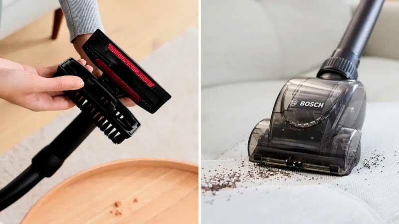 Насадки: 1 насадка для щелей, 1 щетка для мебели, 1 насадка для обивки, 1 турбощетка, 1 насадка для ковров/паркета, 1 насадка для твердых полов, 1 мини-турбонасадка